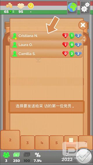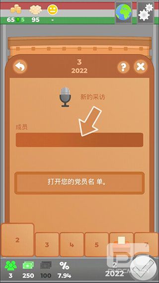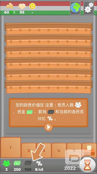 4、您的政党价值显示在左下角这里:其中包含了党员人数、资金、脏钱和当前的选民百分比。