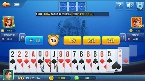 2、叫分从随机一人开始,逆时针顺序开始叫分,可以选择叫1分、2分、3分或者不叫分,所叫分数必须比已叫分高。