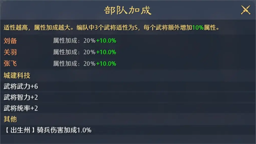 那么武将效果当中,大家还要注意想要同阵营阵容的话,这里得到的10%属性提升会给大家带来更强大的加成,所以前期要兼顾好兵将的品种选择,这里尽量是走同兵种,达到3S阵容就可以达到最大化的属性收益效果,这里根据部队加成,他们带来的属性加成效果当中,适配性越高属性加成就越大,只有3个武将的适配性为S,每一个武将都会额外增加10%的属性,然后根据出生之后带来的伤害加成,就会有更高的百分比提升,而武将进阶在这里根据红度来进行分配的话,会有5个档次。
