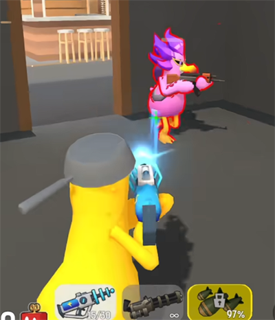 突袭导弹属于战斗鸡的主要杀伤性武器,它的威力在于向目标发射大规模高爆弹药,能迅速提升整个团队的输出,并且可以很好地弥补由于火力弱而产生的短板。与普通武器不同的是,它不能直接释放,必须造成有效的伤害才能积攒能量。游戏开始时,玩家需要使用射速快但是单发伤害低的电波枪,在战场边缘消耗敌人,当武器命中敌人的时候,屏幕下方的技能进度条就会慢慢加载,这是解锁导弹的前提条件。
